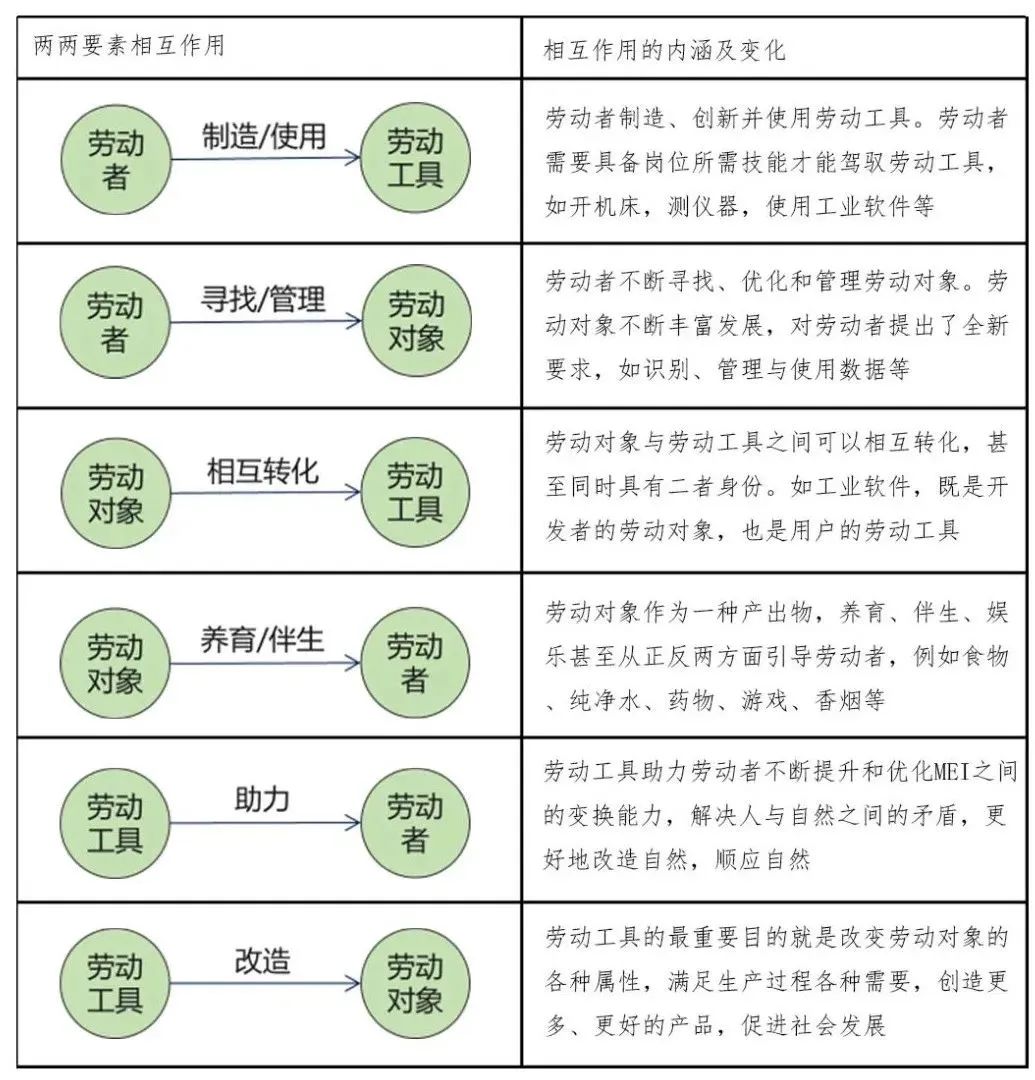 由图2生产力三要素新模型看到,三要素之间的各个要素是彼此两两相互作用的。相互作用的结果及其内涵变化,如表1所示。