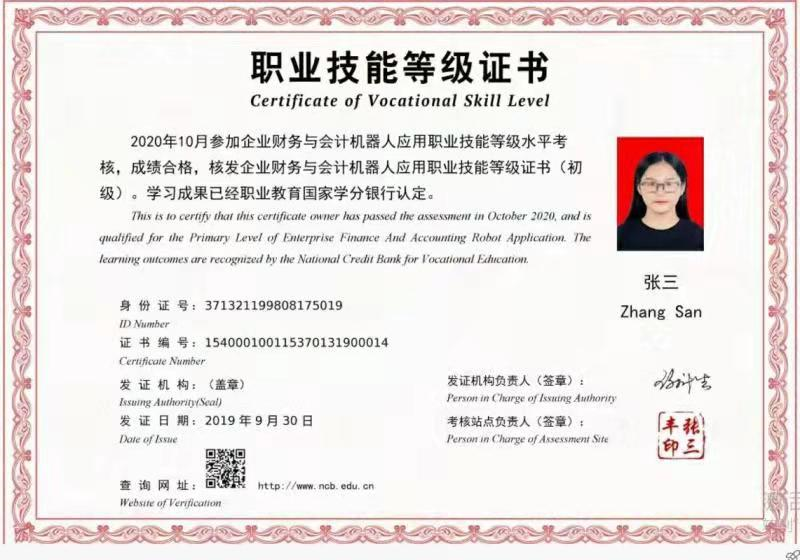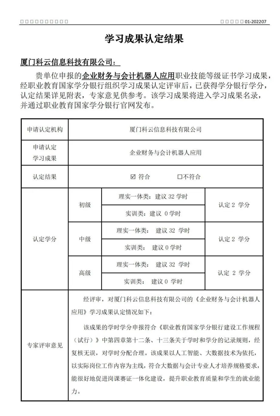 企业财务与会计机器人应用职业技能等级证书(初级、中级、高级)学习成果,经职业教育国家学分银行组织学习成果认定评审后,已获得国家学分银行学分。
