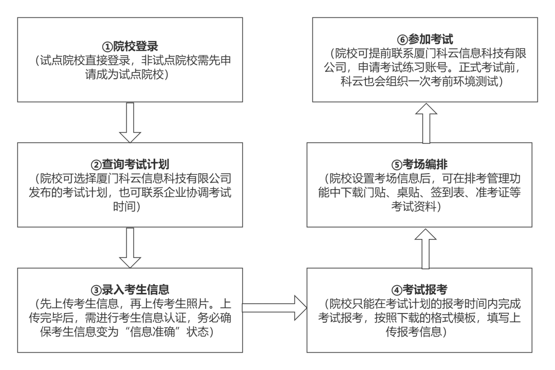 先联系厦门科云考务,完成考场环境验收,然后在“考核站点”中“其他材料”,上传并提交“院校考点环境信息反馈表”,厦门科云审核。如本次报考证书及等级与之前申请的一致,无需再次申请。