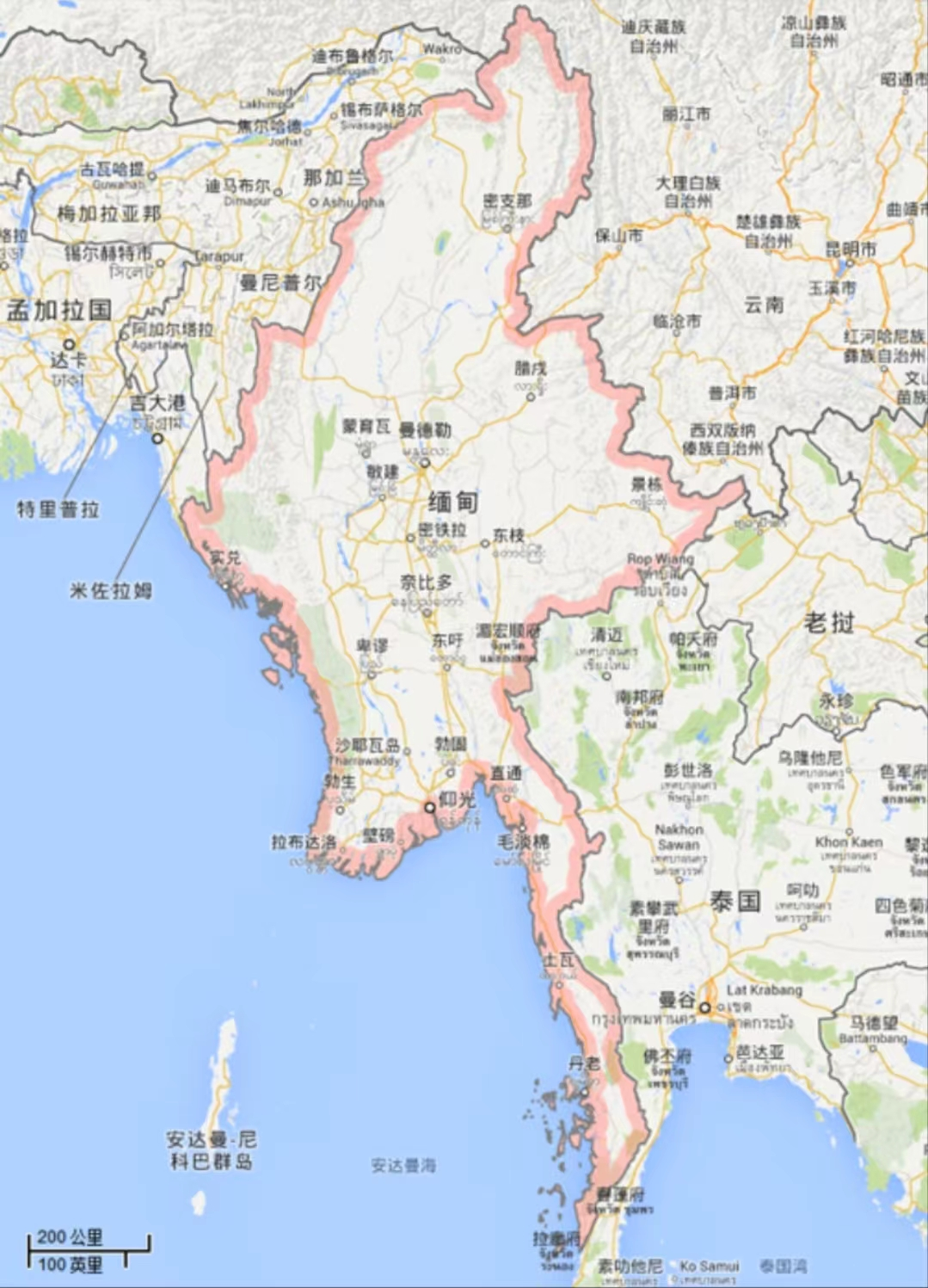 缅甸位于亚洲东南部、中南半岛西部,其北部和东北部同中国西藏和云南接界,中缅国境线长约2185公里,其中滇缅段为1997公里;东部与老挝和泰国毗邻,缅泰、缅老国境线长分别为1799公里和238公里。