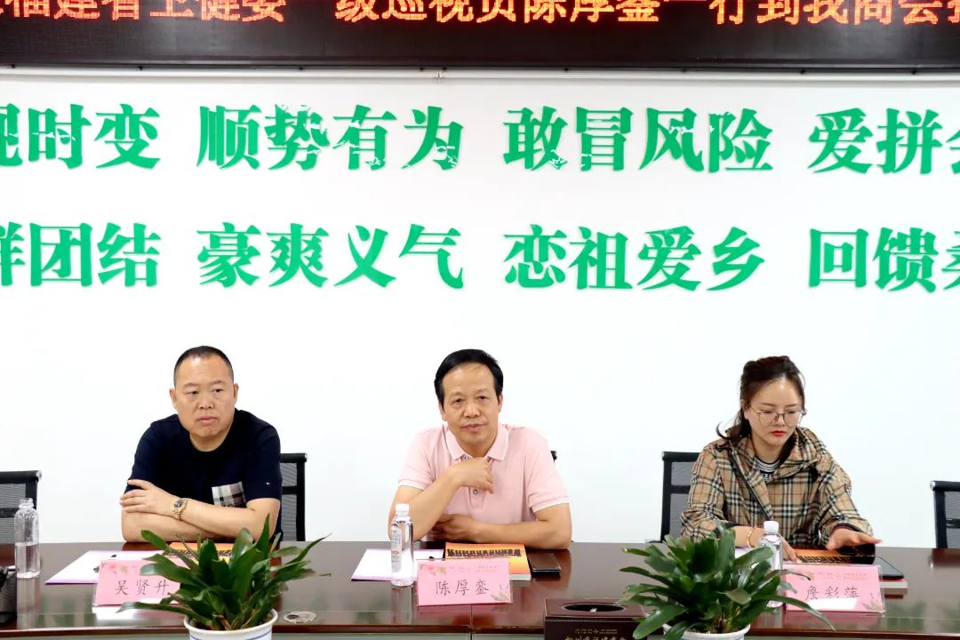 随同陈巡视员来访的上海宏英智能科技股份有限公司总经理詹彩萍、福建禾润国际贸易有限公司总经理吴贤升,先后分别发言,介绍了各自公司的情况,与会的几位商会领导也都作了交流,双方都表示要加强联系,合作共赢。