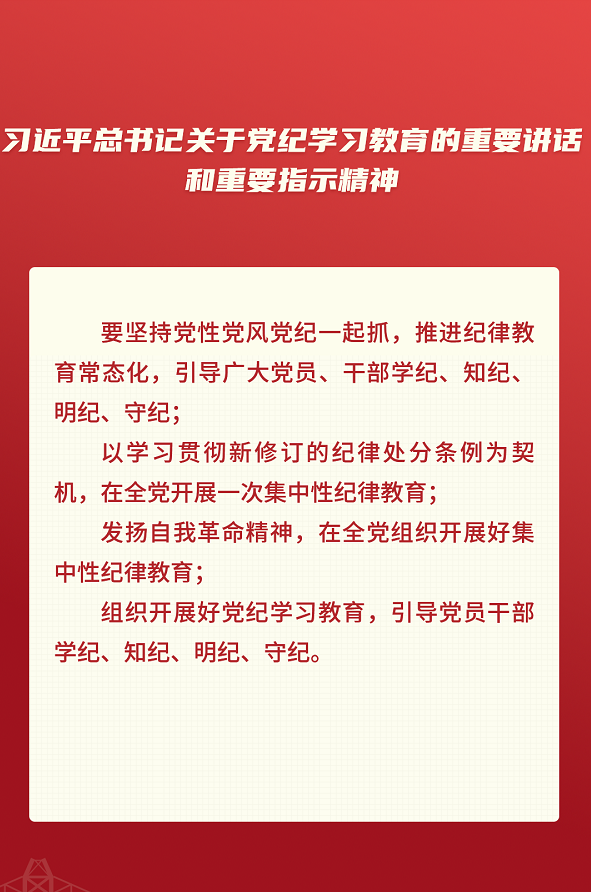 2024年4月至7月在全党开展的党纪学习教育,是加强党的纪律建设、推动全面从严治党向纵深发展的重要举措。汉中公司上下要站在坚定捍卫“两个确立”、坚决做到“两个维护”的政治高度,深刻认识开展党纪学习教育的重大意义。要坚决扛牢管党治党政治责任,突出严的基调深化纪律建设,组织开展好党纪学习教育,以严明的纪律统一思想、统一行动。要通过开展党纪学习教育,进一步深化对加强党的纪律建设重要性和忽视党纪、违反党纪问题危害性的认识,推动各级党组织从严抓好党的纪律建设,引导广大党员干部强化遵守纪律的自觉,树立正确的权力观、政绩观、事业观,始终树牢“人民至上”理念,做到忠诚干净担当。