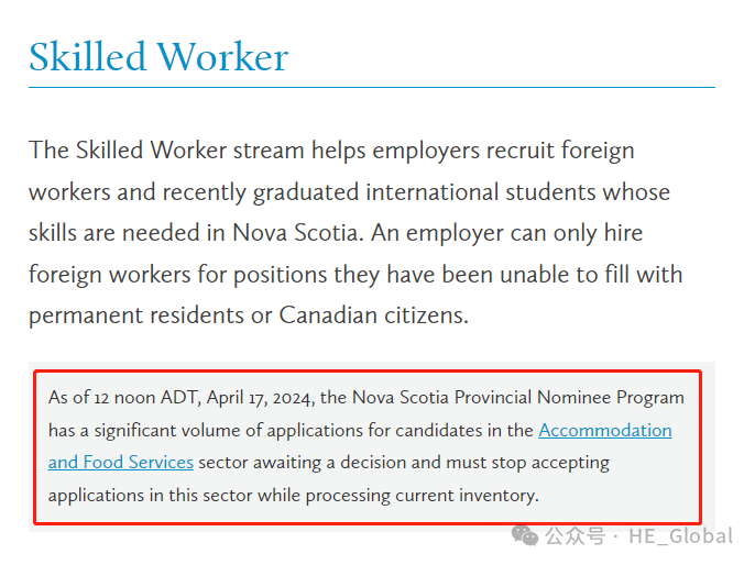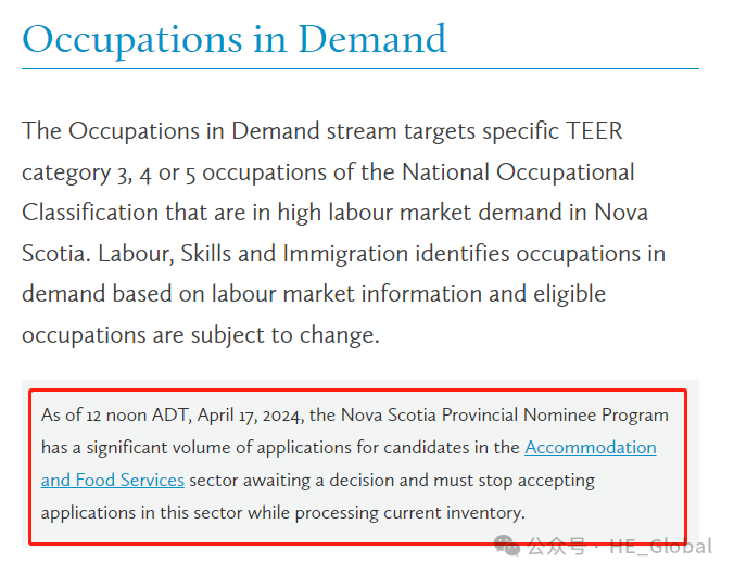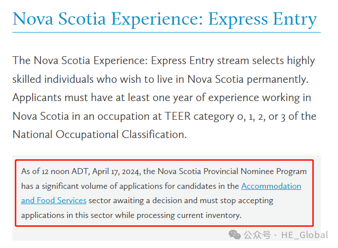 大西洋夏令时间(ADT)4月17日中午12点起,新斯科舍(NS)省提名宣布因NSPNP有大量申请积压,已暂停接受食品和住宿行业(Accommodation and Food Service)新的申请人。也就是从今天起,NANP移民局不再接受从事食品和住宿行业工作的新的申请人的移民申请。如果您从事此类行业并且还未递交省提名申请,就会被影响。