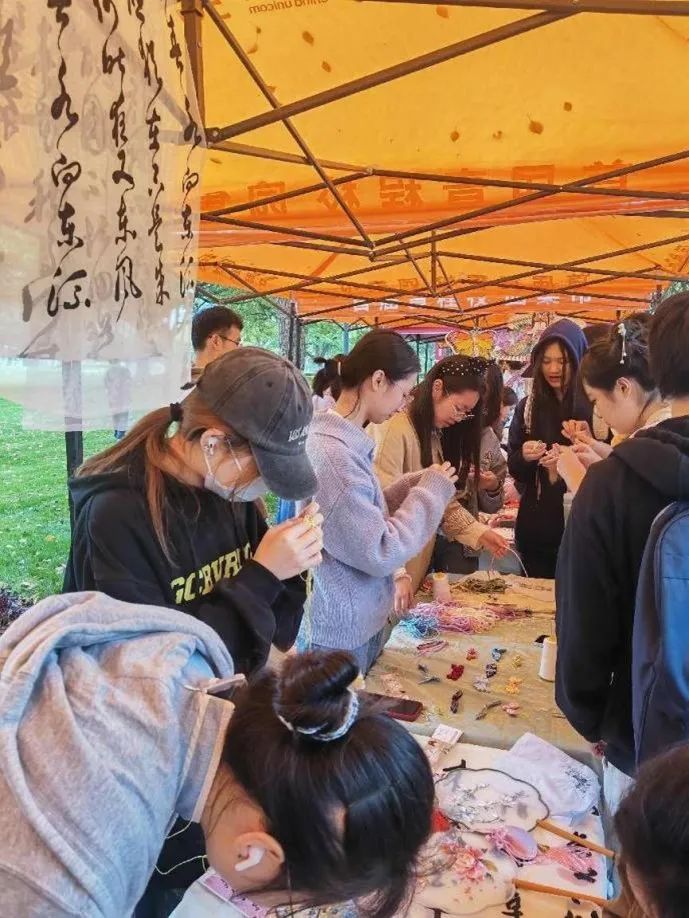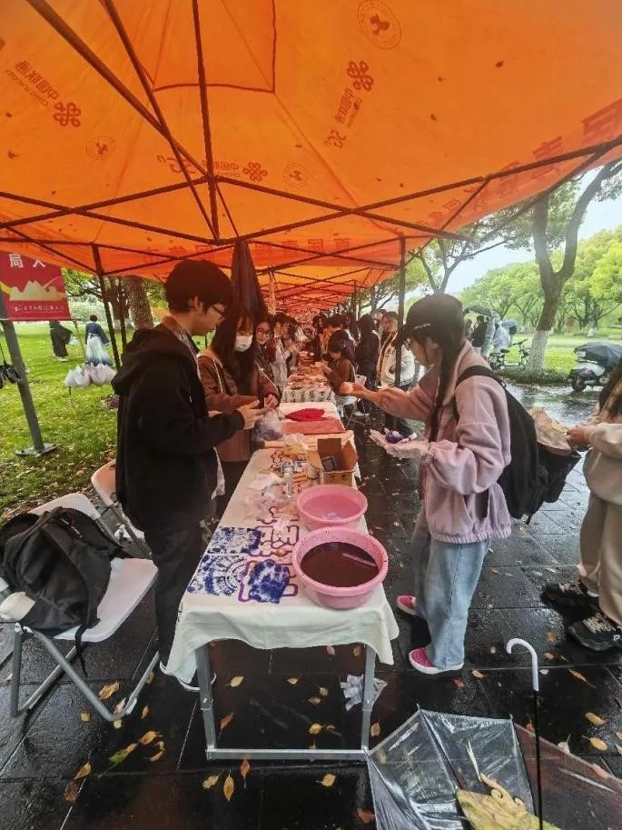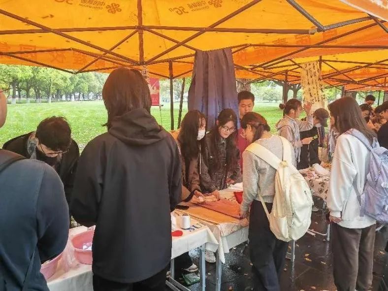 虽然天空飘着绵绵细雨,但文化摊位活动的现场依然热闹非凡。同学们带着对中华传统文化的热爱和好奇,积极踊跃地参与到各类有趣且丰富的传统文化活动之中。