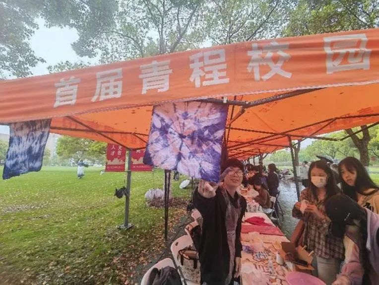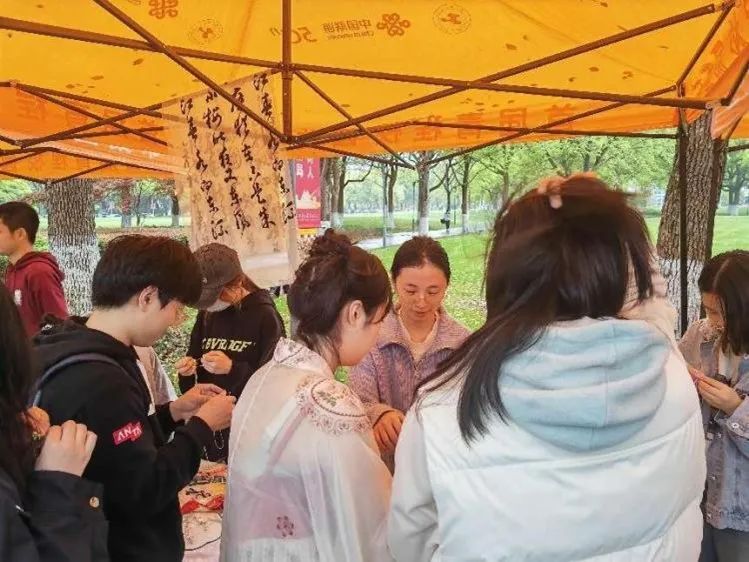 纺织服装学院学院结合我院的特色亮点,选择了中国四大非遗技艺作为“文化摊位”的体验项目——中国传统的手工染色技术扎染;制作衣服的基础布料绫罗绸缎;旗袍的点睛之笔盘扣;以及上海市民间传统美术、国家级非物质文化遗产之一的顾绣。樱花大道上洋溢着浓郁的传统文化气息,吸引了众多师生的参与。他们跟着摊主们学习制作属于自己的传统文化作品,亲自体验传统非遗技艺的独特魅力。让师生在参与活动的过程中,不仅学习了传统非遗技艺的知识和技能,更让传统非遗技艺在新时代充满了活力与生机。