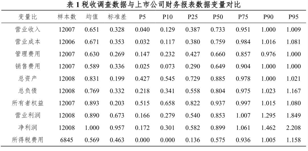 根据匹配后的数据计算了利润表、资产负债表中的重要变量和企业所得税费用的变量比,结果如表1所示。可以看到,全部变量的变量比都要小于1,且绝大部分变量比的90分位数在1左右,意味着对于90%的观测值而言,税调数据变量的数字要小于上市公司财报数据的数字。