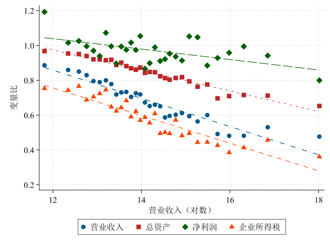 我们还可以进一步分析看哪些企业的税调数据变量更可能低于年报。图2描述了企业营收规模和变量比的关系,可以直观的看到营收规模越大的企业,税调数据变量相较于年报数据会越小。图3用总资产衡量企业规模,同样可以发现规模越大的企业变量比越小。