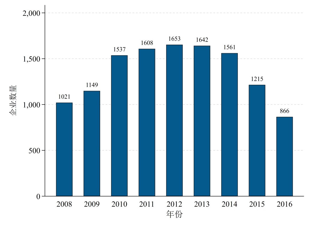 基本思路是将2008-2016年的税调数据与同时期上市公司财务报表数据匹配,比较两套数据中相同变量的大小。我们首先匹配两套数据,在剔除变量缺失的样本后,保留了大约12000个观测值,具体分布如下: