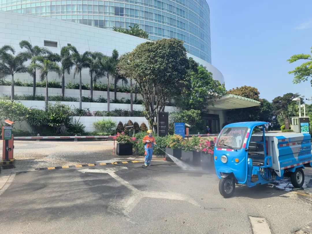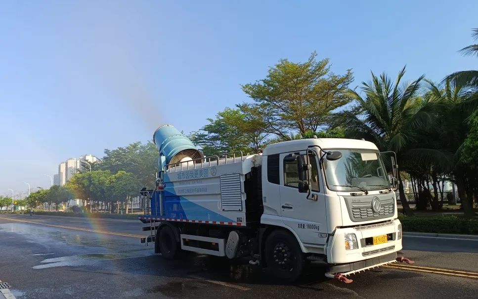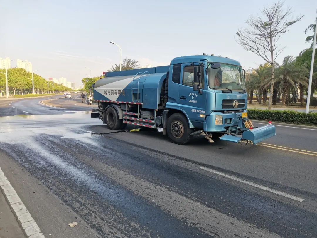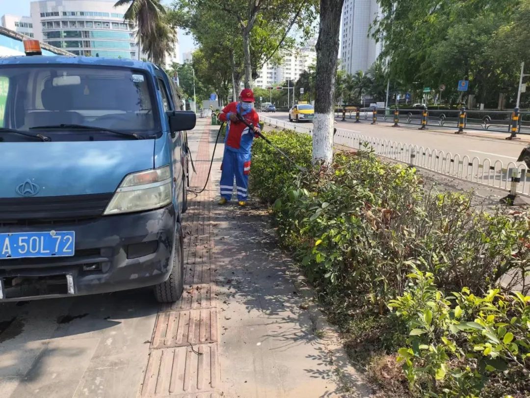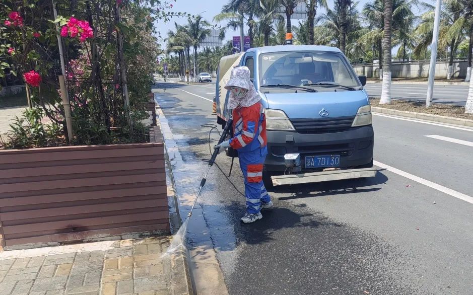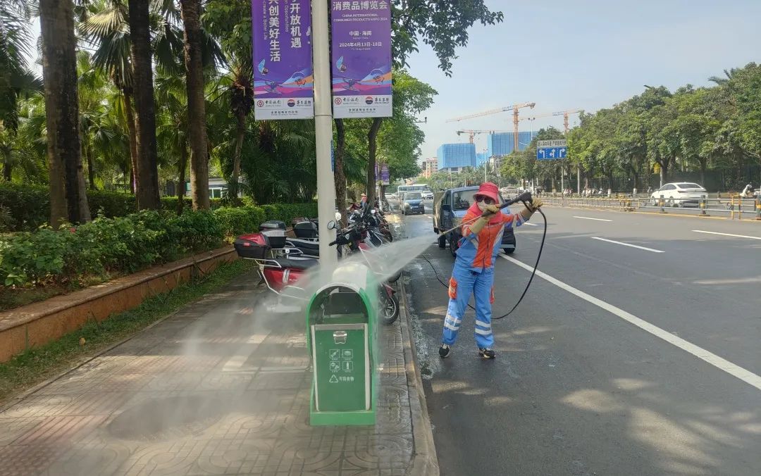 采取“水车冲洗+扫车洗扫+人工冲刷”作业模式,加强美兰机场、高铁、高速公路口、网红打卡点等重点区域路面及周边路段的路灯杆、交通标志线、护栏、环卫设施、公交站台、人行道、高架桥墩等全方位深度清洁,提高道路洁净程度。同时,专门安排2辆洗扫车和1辆雾炮车对重点区域路段进行循环保洁和喷雾降尘,有效保证消博会期间城区道路洁净。
