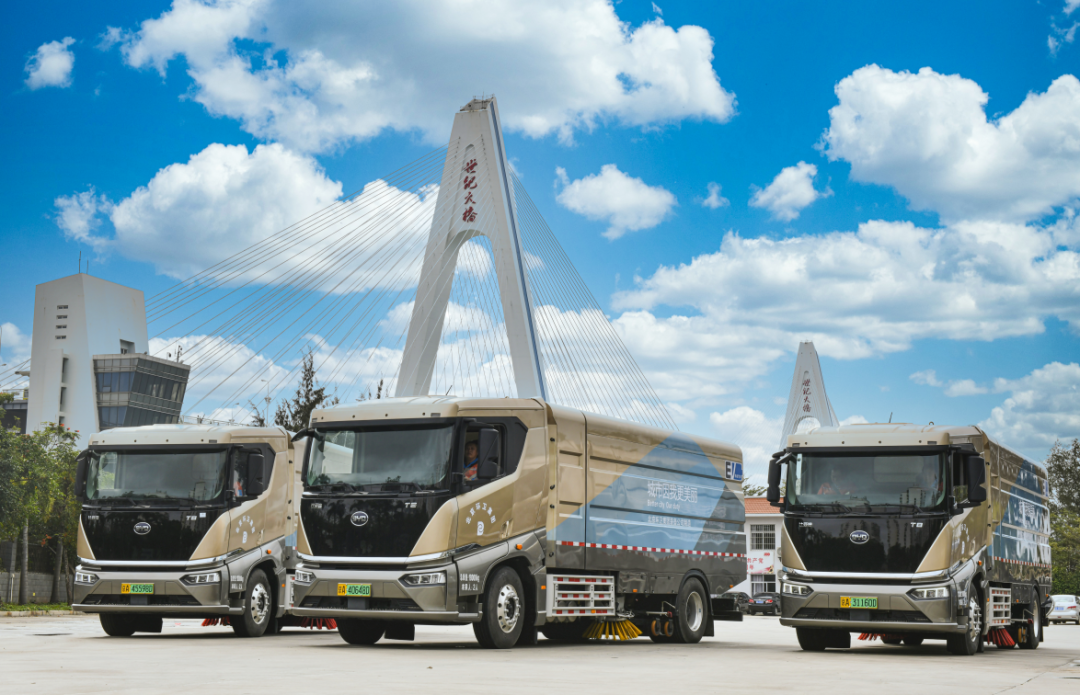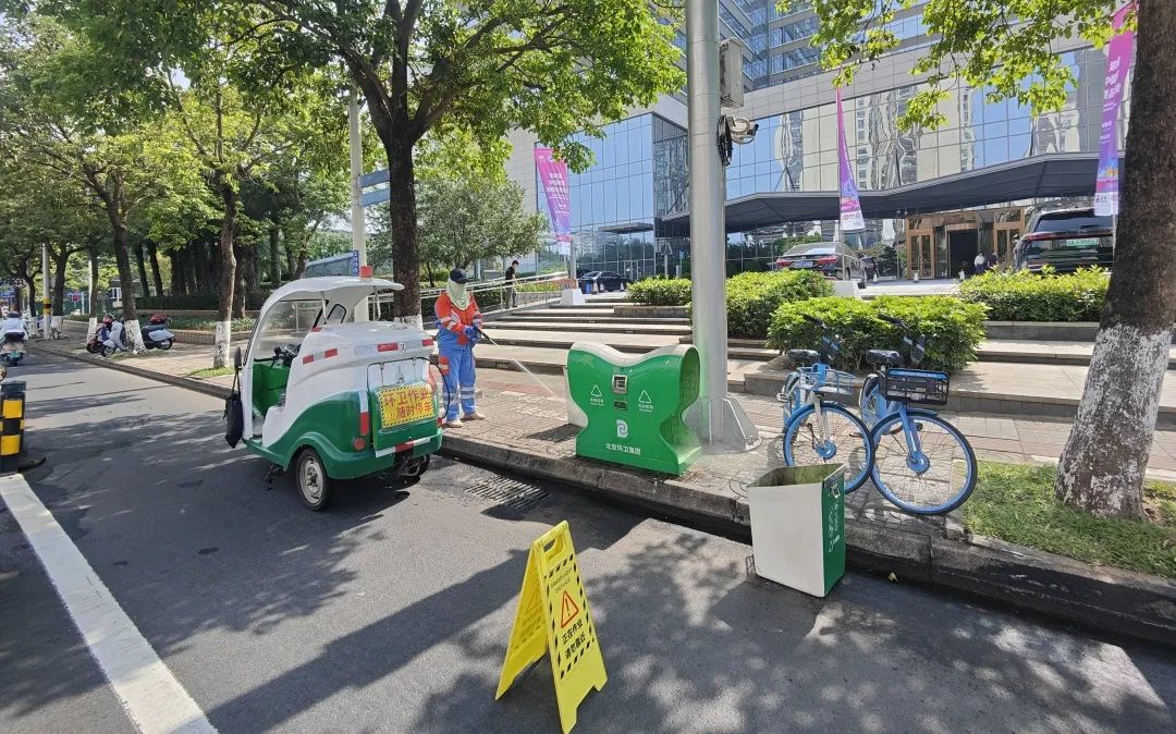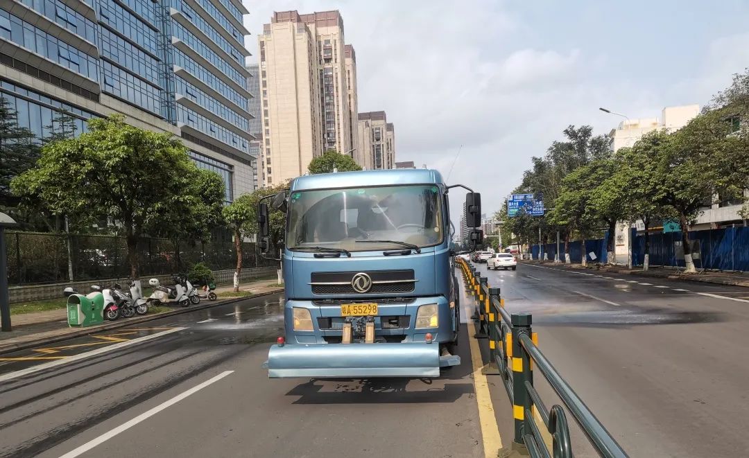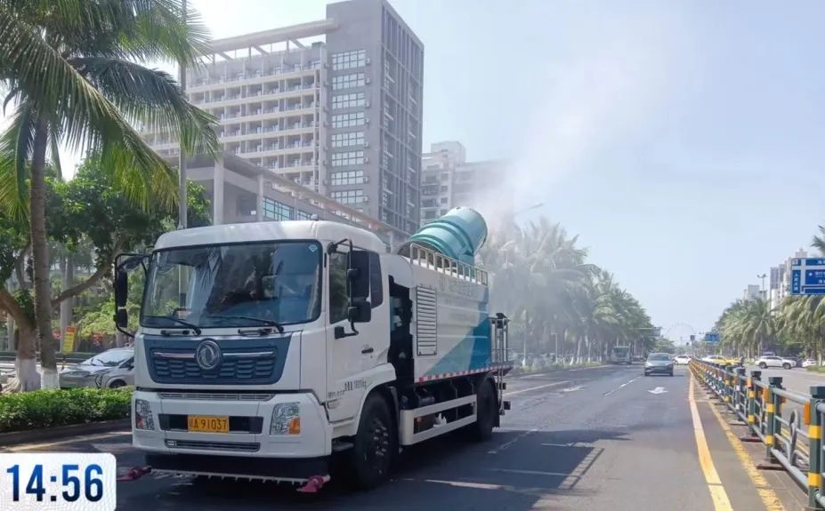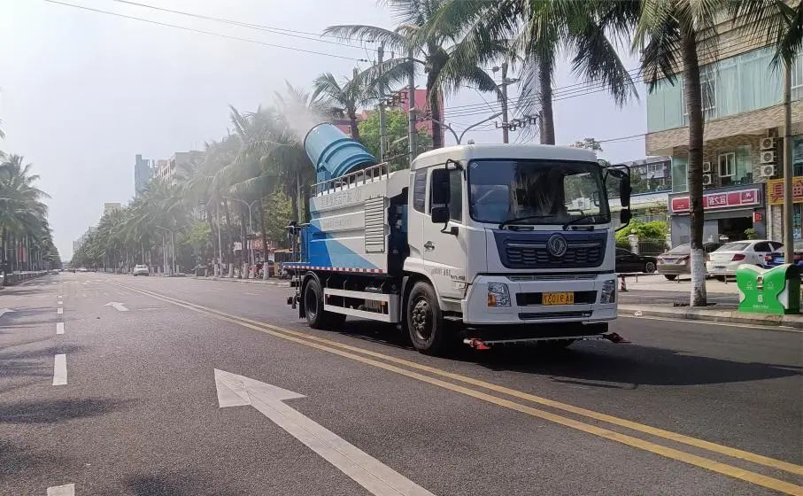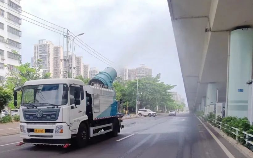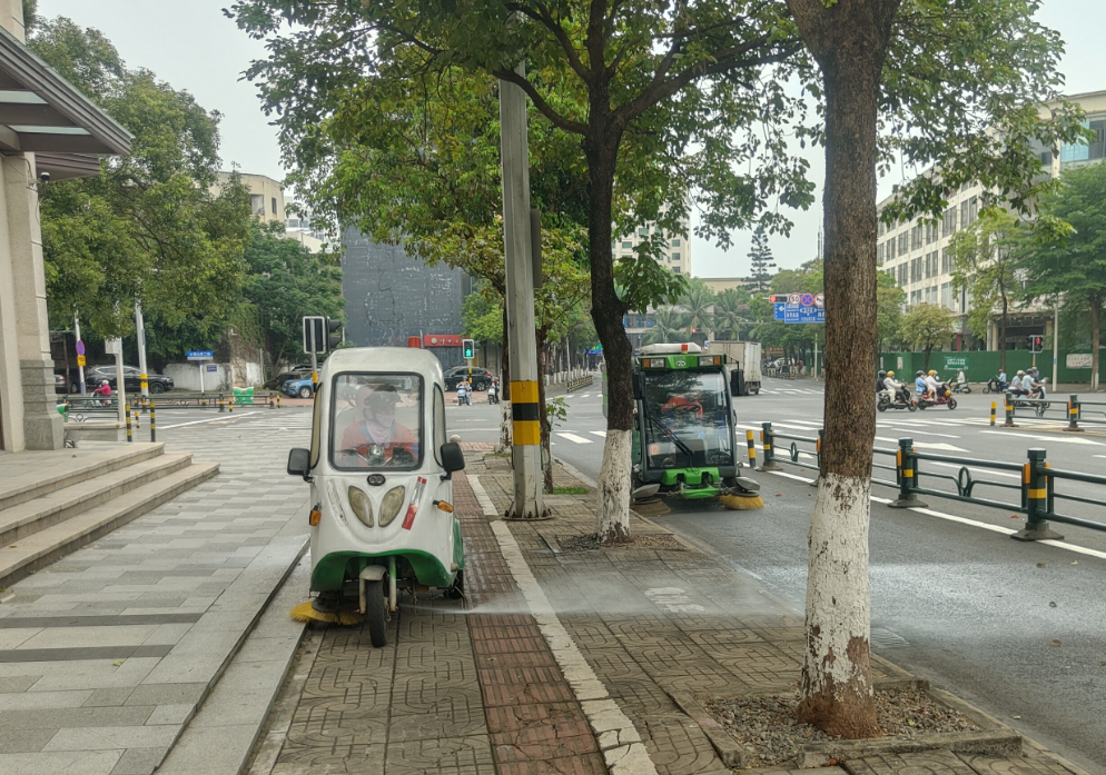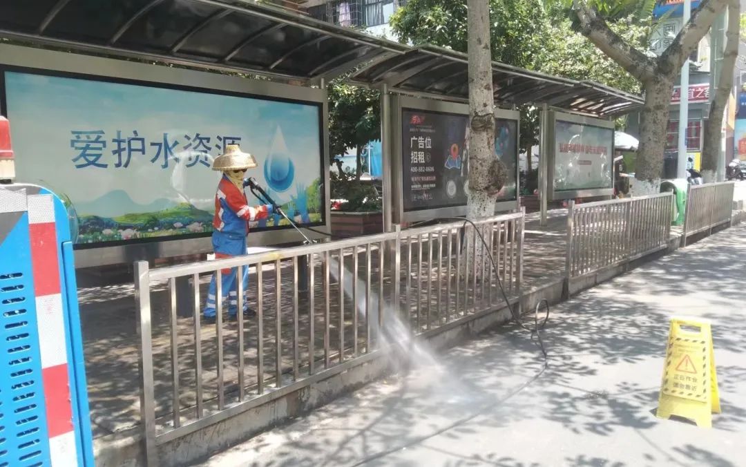 采取“水车冲洗+扫车洗扫+人工冲刷”作业模式,加强美兰机场、高铁、高速公路口、网红打卡点等重点区域路面及周边路段的路灯杆、交通标志线、护栏、环卫设施、公交站台、人行道、高架桥墩等全方位深度清洁,提高道路洁净程度。同时,专门安排2辆洗扫车和1辆雾炮车对重点区域路段进行循环保洁和喷雾降尘,有效保证消博会期间城区道路洁净。
