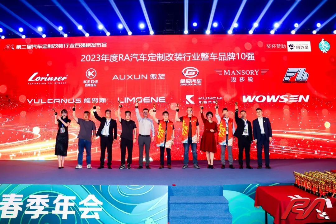 此次参会企业涵盖全国各大主机厂、授权厂、改装厂、配件配套企业、设计企业、经销商、商改门店等。历时四个月,经过多轮角逐和评审,通过对信息申报、资料审核、市场调研,以及企业规模、企业经营状况、2023年度新专利数量、参加行业活动及获得荣誉情况、获得政府奖励及荣誉情况、企业征信评级、行业调研评估等七大维度的细致评分,江苏车驰傲旋汽车喜获2023年度中国汽车定制改装行业“整车品牌10强”奖项。
