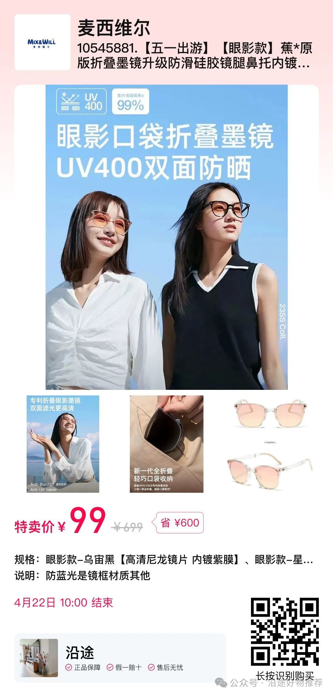 全隔绝400波段一下所有的紫外线有害光!价格很香,医用级别不锈钢镜架,高清偏光尼龙镜片,搭载专利折叠系统,实现三维全折叠,折叠后仅20mm,22g轻盈无压力,品质非常高!气垫鼻托!UV400高效滤光!品牌同款内镀紫膜!简单一句就是除了没有LOGO,其他毫无差别!!这四颜色完全都在我的审美点上!!枪框绿片(杰伦同款)戴着这样一副墨镜出门,走哪都是焦点!