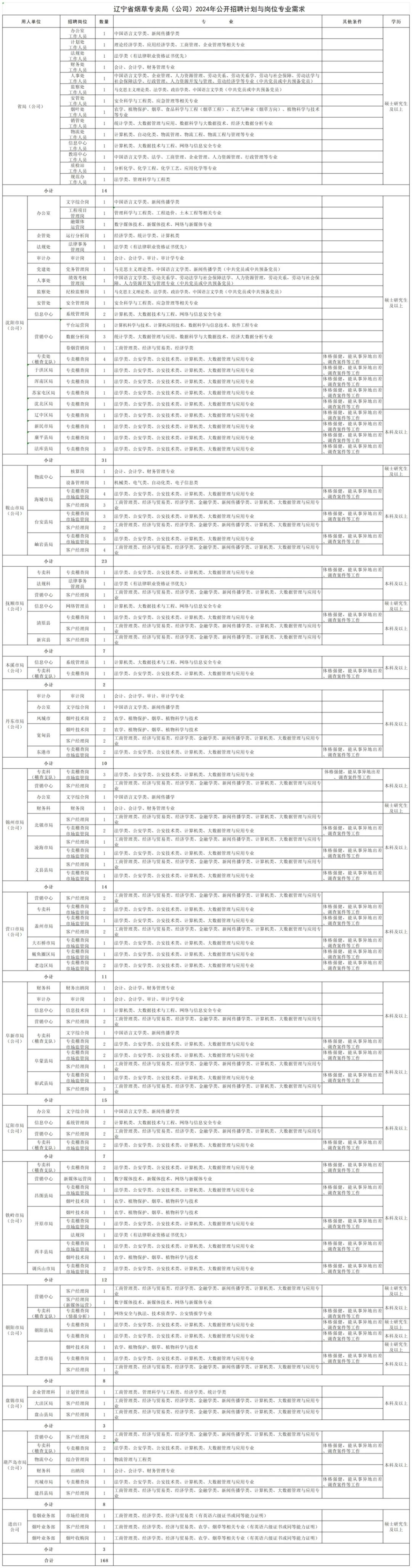 本次招聘岗位计划、专业及资格要求,具体详见《中国烟草总公司辽宁省公司2024年人员招聘岗位计划与资格条件》(附件1)。