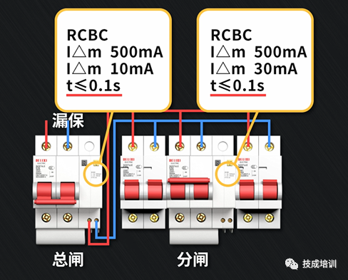 例如上图中的分闸漏电动作电流是30mA,但总闸是10mA,如果分闸的出线侧发生漏电故障,且漏电电流小于30mA,但大于10mA,显然总闸跳而分闸不跳。