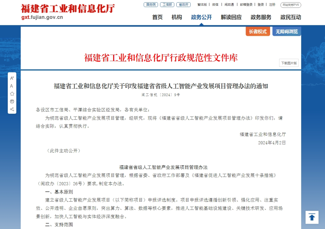 为规范省级人工智能产业发展项目管理,根据省委、省政府工作部署及《福建省促进人工智能产业发展十条措施》(闽政办〔2023〕26号)要求,近日,省工信印发通知,制定《福建省省级人工智能产业发展项目管理办法》。