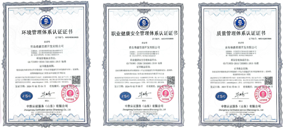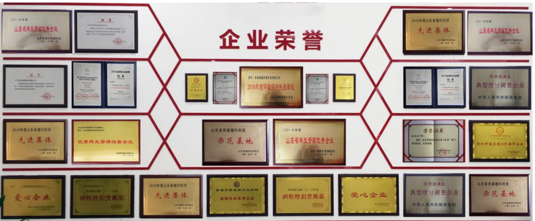 山东省商务厅备案机动车报废企业、现为青岛市定点机动车报废企业、工信部废钢铁加工行业准入公告企业(年购销废钢铁80万吨认证)、高新技术企业、青岛市“专精特新”企业、山东省物资再生协会副会长单位、青岛市物资回收利用协会会长单位、中国钢铁利用协会理事单位等。