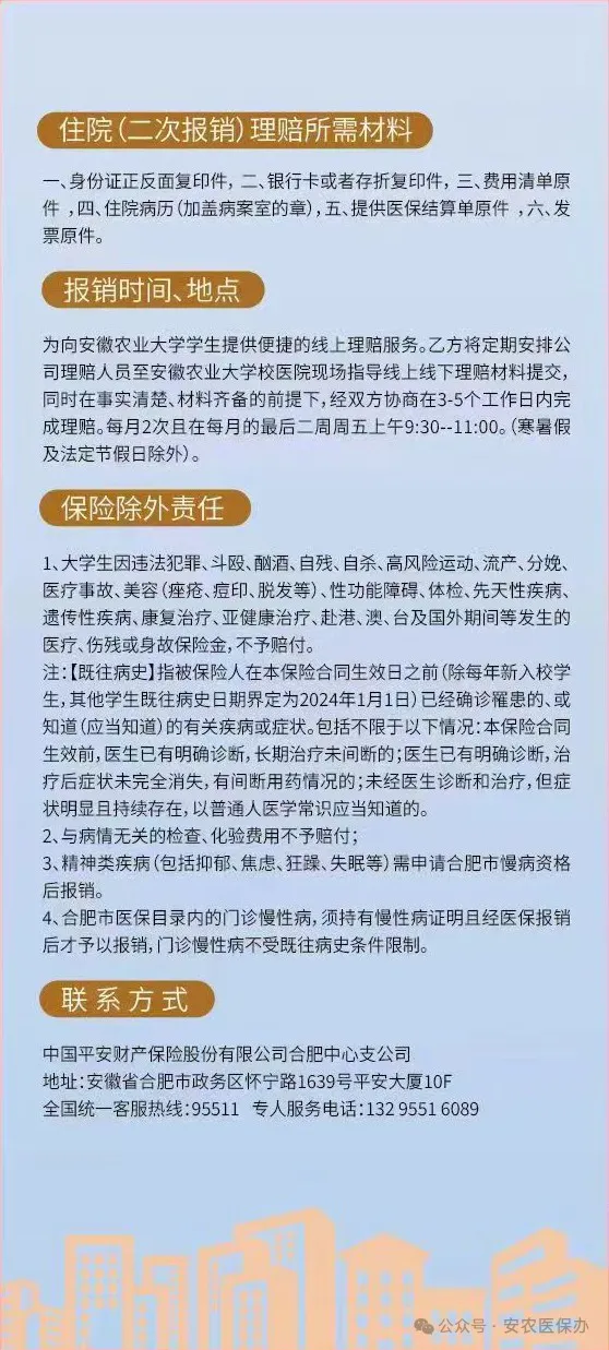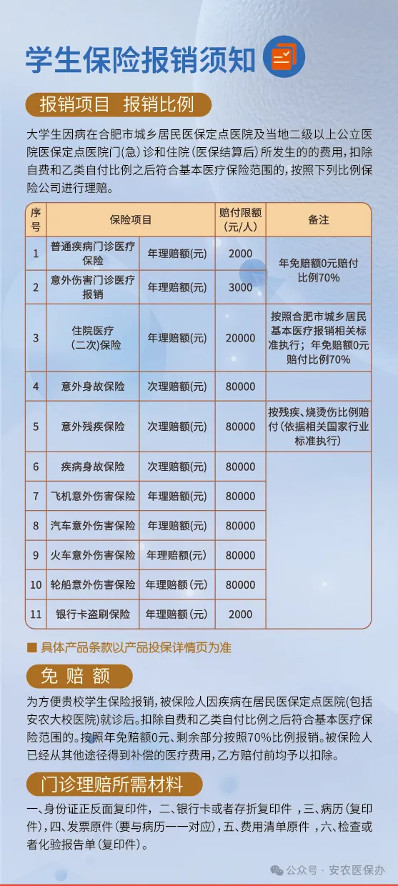 五、线下答疑指导:每月安排2次线下答疑指导,时间为每月最后二周周五上午9:30—11:00(寒暑假及法定节假日除外),地点在校医院五楼503室 (一)门诊理赔所需材料:1.身份证正反面复印件2.银行卡或者存折复印件3.病历(复印件)4.发票原件(要与病历一一对应)5.费用清单原件6.检查或者化验报告单(复印件) (二)住院(二次报销)理赔所需材料:1.身份证正反面复印件 2.银行卡或者存折复印件3.费用清单原件4.住院病历(加盖病案室的章)5.提供医保结算单原件6.发票原件