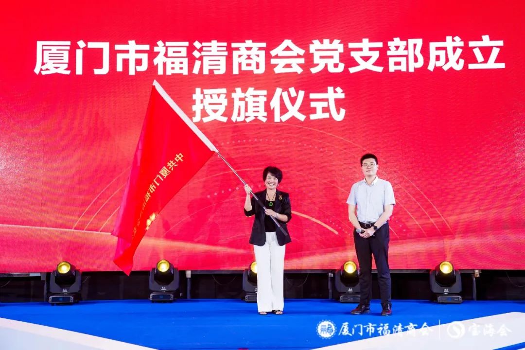 厦门市思明区筼筜街道党工委副书记 张煜宣读了厦门市福清商会党支部成立批复并为福清商会党支部书记吕鸿授旗。希望在党的引领下,我们携手并进,共创未来。