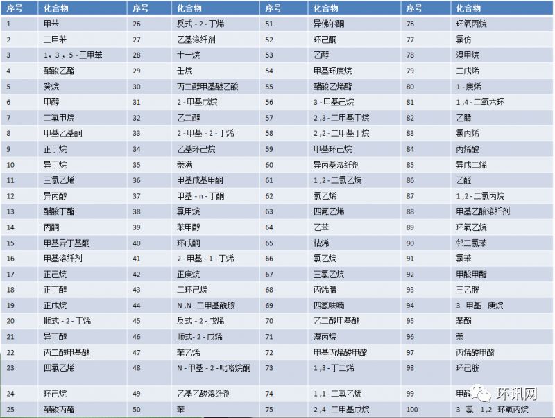 → 化工厂在生产过程中会产生大量的VOC如:苯系物、有机氯化物、氟利昂系列、有机酮、胺、 醇、醚、酯、酸和石油烃化合物等。其中常见的VOC种类有甲苯(Toluene)、二甲苯 (Xylene)、对-二氯苯 (para-dichlorobenzene)、乙苯 (Ethyl benzene)、 苯乙烯(Styrene)、甲醛 (Formaldehyde)、乙醛 (Acetaldehyde)等。苯、甲苯、卤代烯烃(三氯乙烯、二氯乙烯) 等已被怀疑或确定为致癌物质。