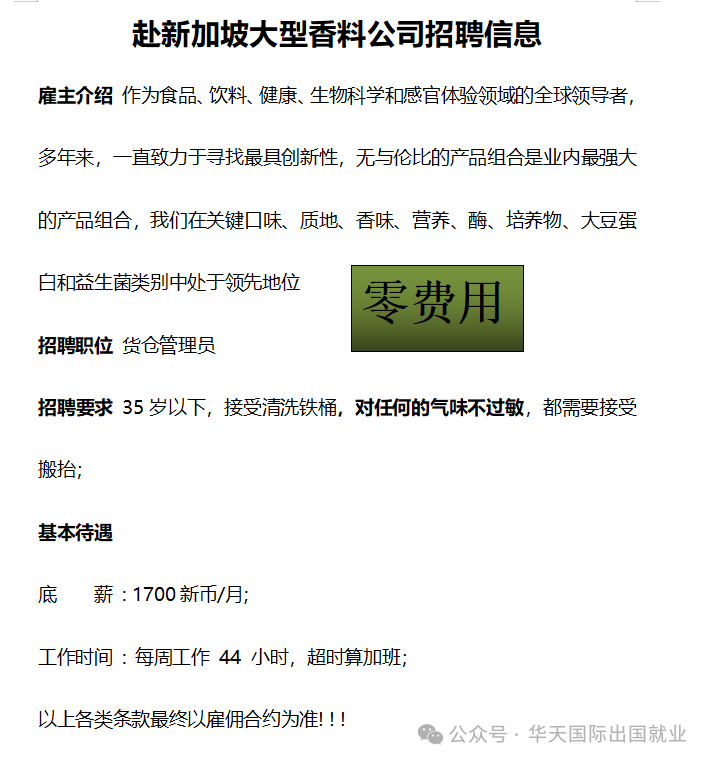 【高薪-零费用】新加坡香料公司 招聘普工,男生,35岁以下,接受清洗铁桶,对气味不敏感,参考综合2500新币左右或以上!