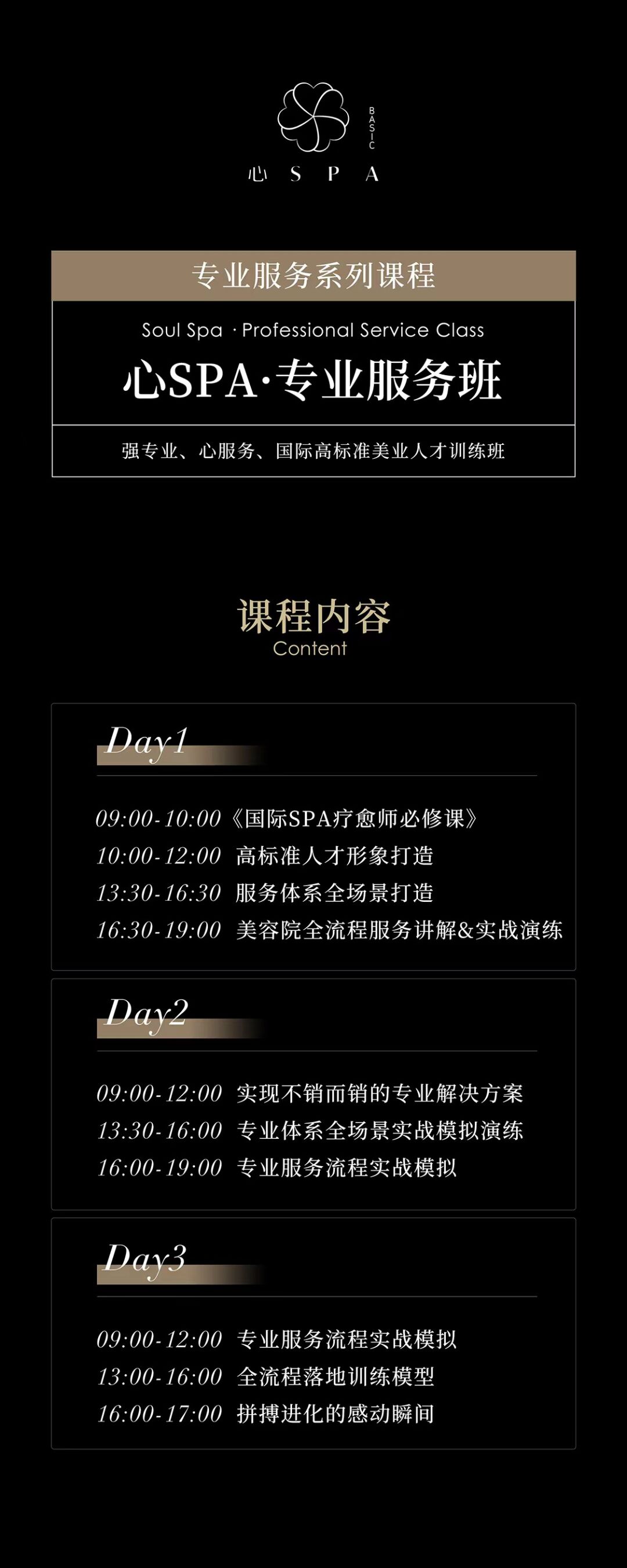 作为强专业、心服务、国际高标准的美业人才训练班,心spa专业服务班将带领定制专业解决方案,以技术驱动情感链接,以服务激发五感六觉极致体验。