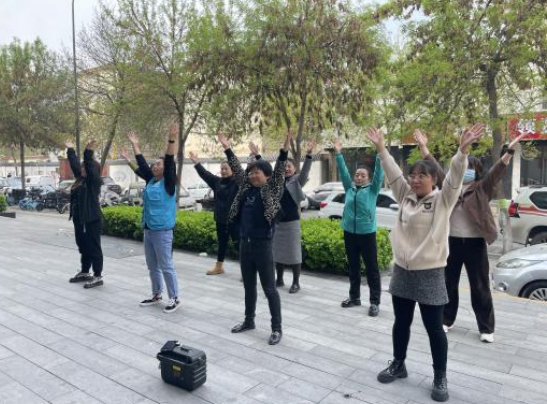 活动中,社区志愿者介绍了健身操对锻炼身体的好处,紧接着带领居民们进行拉伸活动。居民们兴致勃勃地跟着做起了准备动作,压腿、抬腿、屈膝、伸展手臂,伴随着音乐的节奏,享受着健身操带给他们的愉悦。