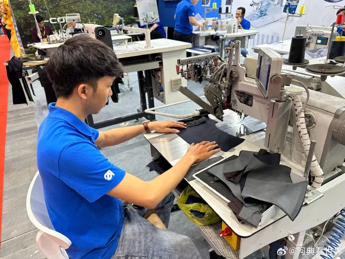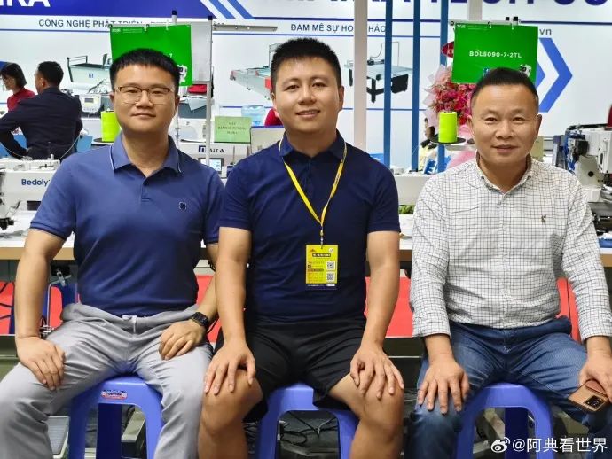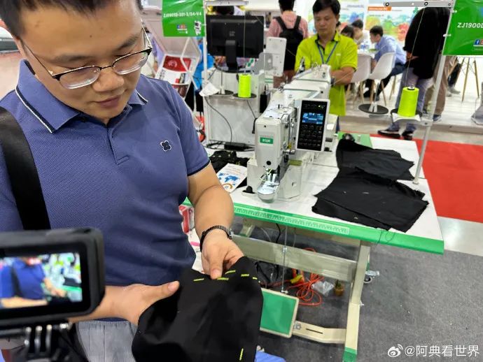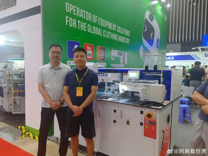 我当时在跟小蔡在展会中参观,小蔡正在给我介绍他们缝纫机产业和纺织产业转移到海外的情况。