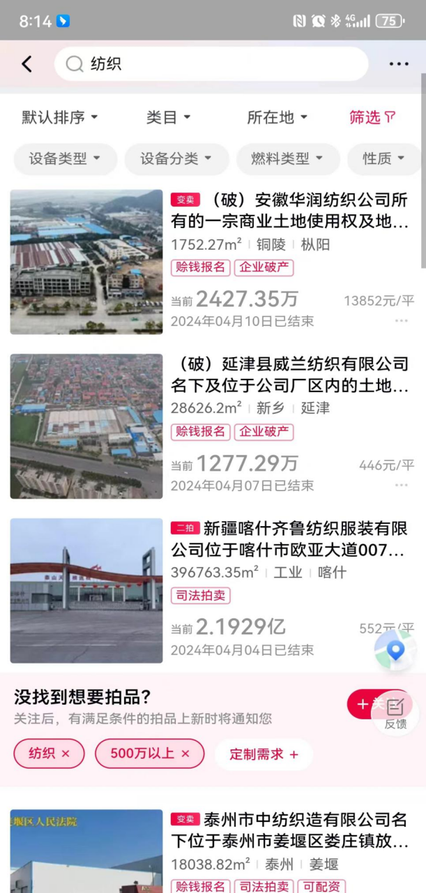 打开阿里拍卖,我们发现,仅仅4月前10天,已经完成的价值超过500万元的纺织企业拍卖已经达到了7宗,仅有福州市立峰纺织有限公司名下位于长乐区漳港街道渡桥村的房产及土地及机器设备被以4760万的价格拍下,其余6宗皆流拍。