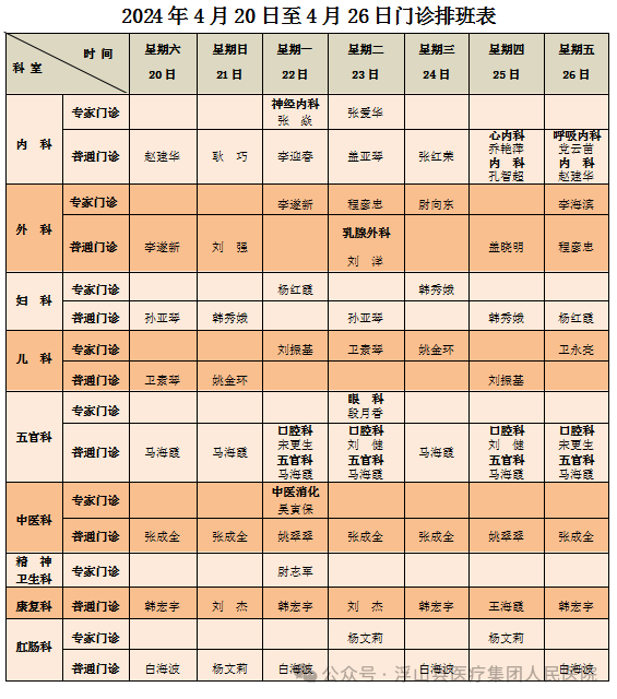 为了更好地方便广大患者朋友们,现将浮山县医疗集团人民医院4月20日——4月26日门诊坐诊医生排班表告知大家。