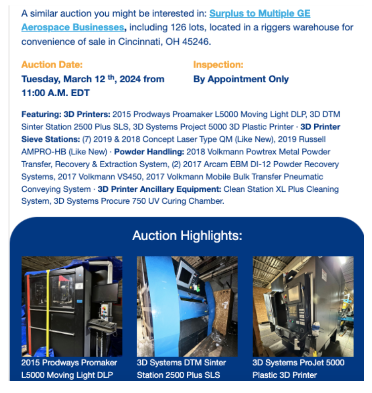●GE航空多个剩余资产也正在被拍卖,其中包括:2015 年 Prodways Promaker L5000 移动光机、3D DTM Sinter Station 2500 Plus SLS、3D Systems ProJet 5000、2019 和 2018 年Concept Laser 质量管理系统、2017 年 Arcam EBM DI-12 粉末回收系统和 3D Systems的750 UV 固化室。与西屋制动一样,GE 的年度报告也强调了公司内部的显著增长,包括终端市场的强劲需求以及与上一年相比收益增加了两倍多,自由现金流增加了近 70%。