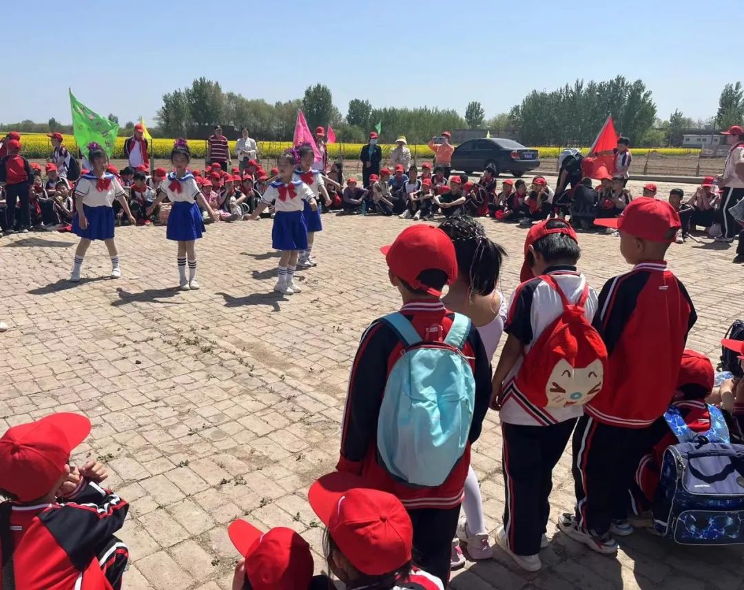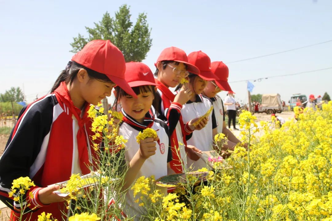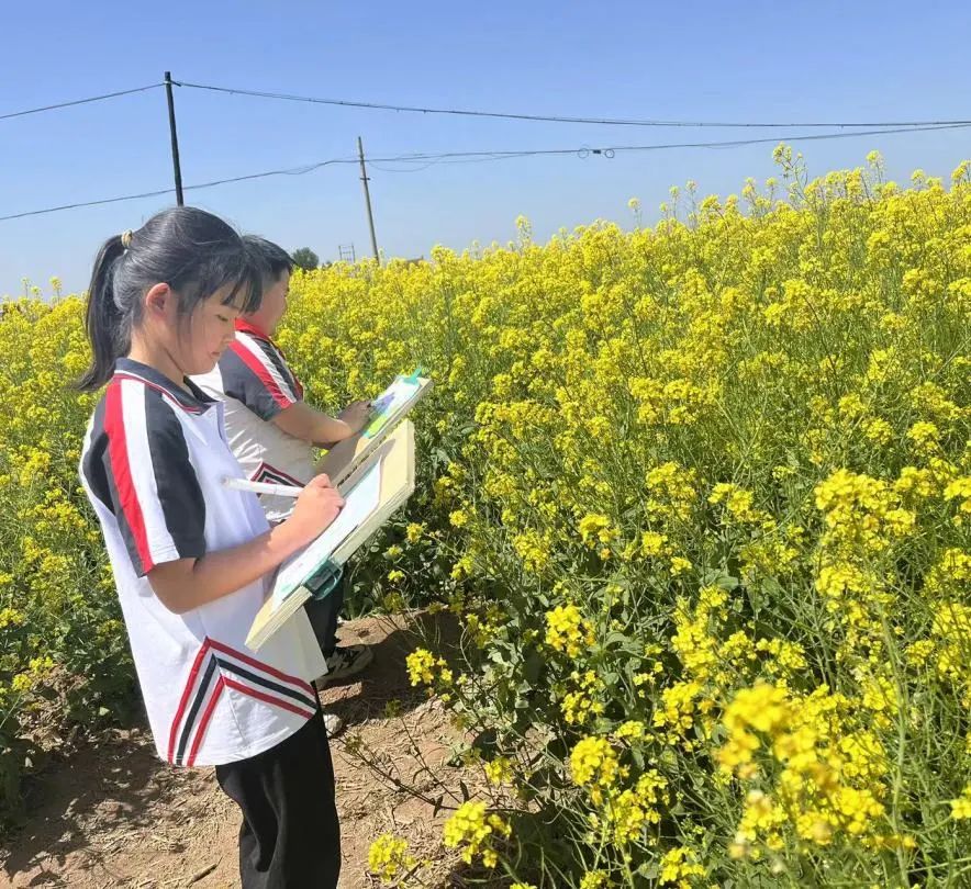 本次研学活动的最后一站,同学们来到了我镇起凤庄村万亩油菜种植示范基地,成垄的油菜长势喜人,将大地染成了一片金黄。来自河北省农林科学院旱作农业研究所的研究员李和平为学生们详细科普了油菜的类别、种植技术及用途。孩子们在深入了解过油菜花的外观及特性之后,纷纷拿起画板记录春天,用巧手绘制美丽的春景。低年级的小朋友们还表演了歌舞,来表达对春天的热爱。