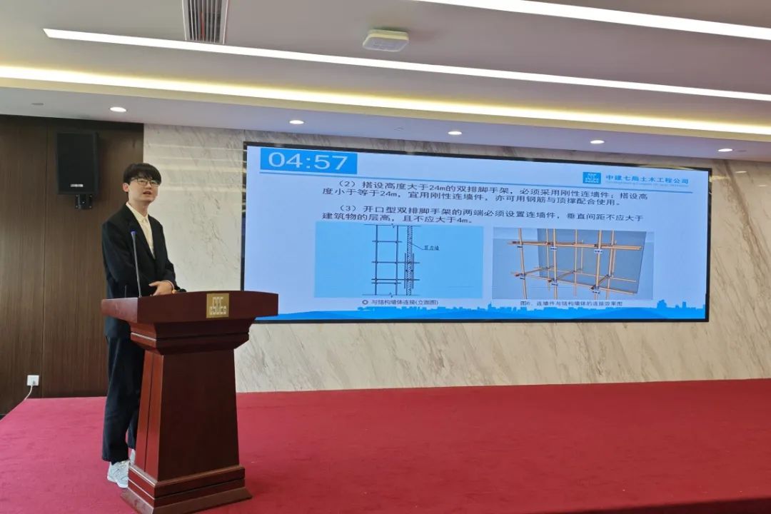 安全教育培训环节,参赛选手从班组长职责及能力提升、高风险作业人员安全管理、大型机械设备管理、临时用电管理等方面开展教育培训。选手们举止大方、精神饱满,授课观点鲜明、见解独到,充分展示了个人的授课能力。
