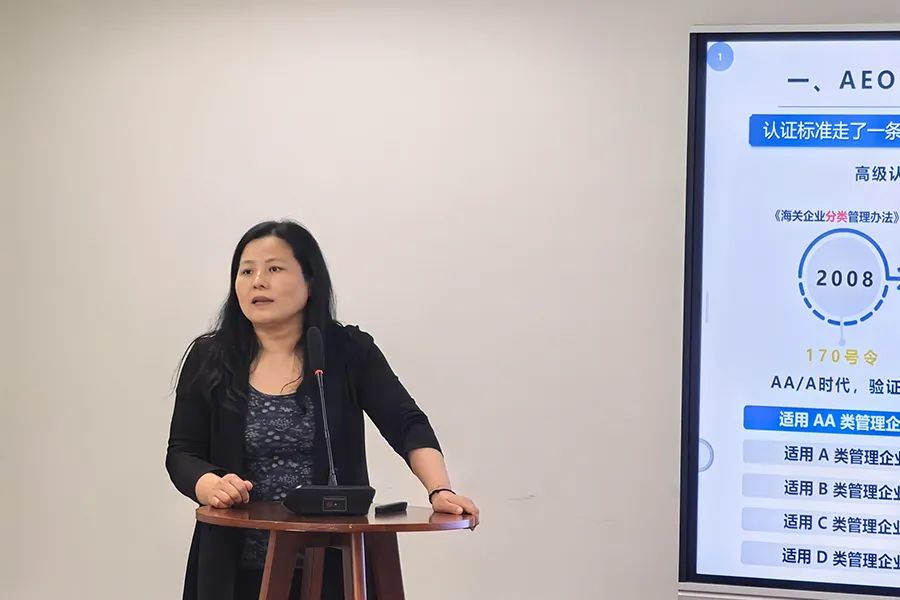 为助力企业全面提高进出口环节内部各项管理规范,有效规避国际贸易摩擦,增强企业的国际竞争力,会议邀请已为宇寿医疗、普天铁心、确成硅化学、钰邦电子、松洋压缩机、全讯射频科技等多家获得海关高级(AEO)认证资质的出口企业提供认证诊断、关务内审和认证辅导服务的高级(AEO)认证资深专家江苏弗莱尔机电科技公司仝娟工程师宣讲了海关高级(AEO)认证的政策优势、给外贸企业带来的好处和申请认证的主要条件及流程。