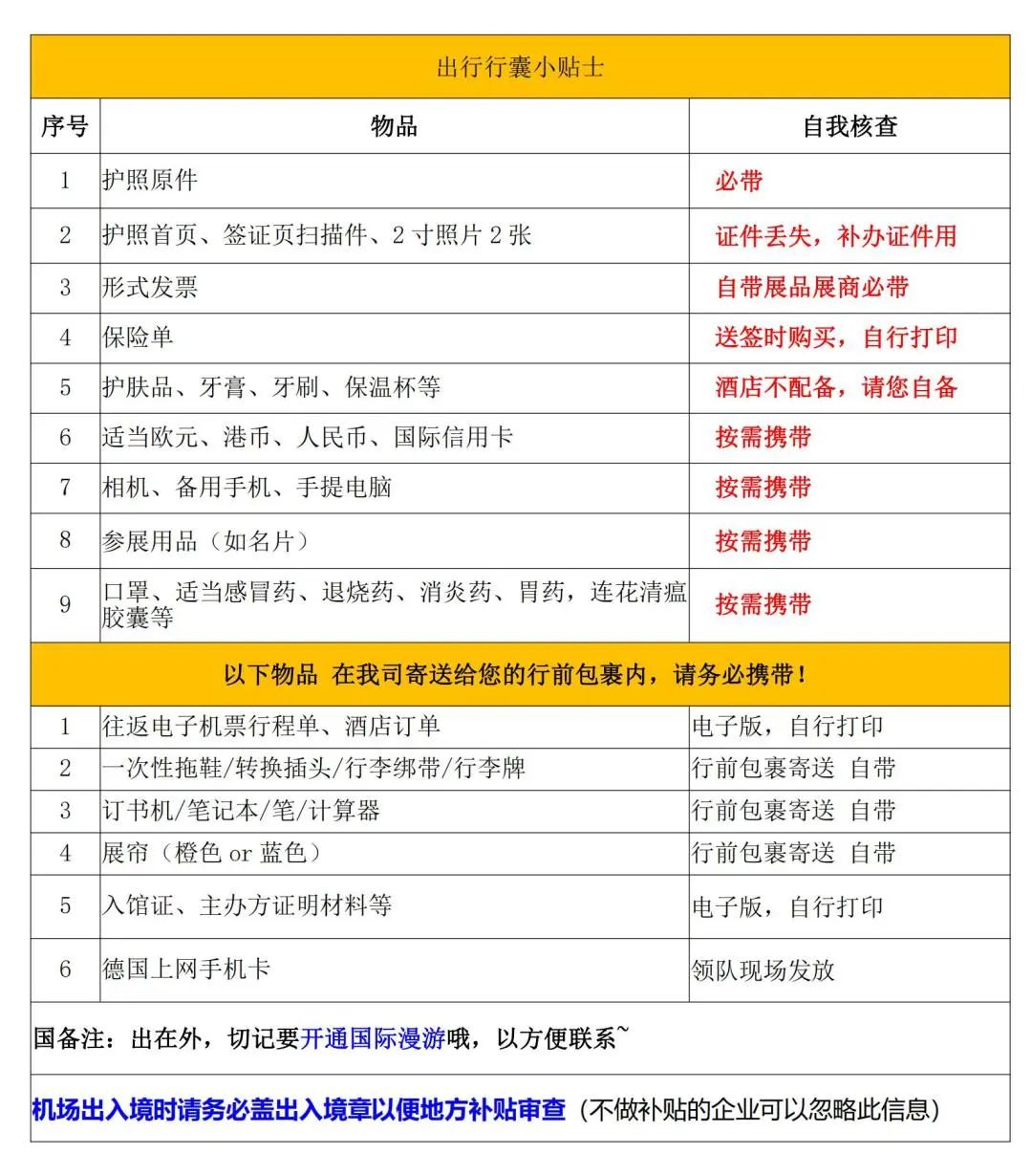 2.若自行携带样品,请务必用行李箱或折叠小推车装运,方便托运、过关,以及机场、展馆的进出,并携带形式发票。