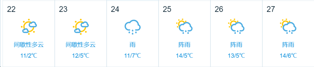 平均最高温度14℃,最低气温2℃。请带好合适衣物及便捷雨具,做好保暖措施。