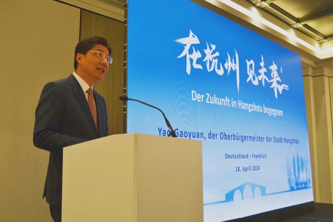 姚高员市长从历史文化名城、创新活力之城、生态文明之都等三个方面简要介绍了杭州经济社会发展概况。他表示,杭州作为中国电子商务之都、中国数字经济第一城,2023年数字经济核心产业增加值达805亿美元,数字贸易额达452.8亿美元。今年9月,杭州将举办第三届全球数字贸易博览会,这是中国数字贸易领域唯一国家级、国际性、专业型展览,也是汇聚全球数字经济领域精英的盛会,更是推动数字贸易发展、促进国际合作的重要平台,诚挚地邀请德国朋友通过数贸会舞台,展示最优最强的德国制造,体验中国最新最快的现代化发展,感受历史与现实交相辉映的杭州之美;热切地期待双方加强交流合作,在跨境电商、跨境支付、离岸贸易等领域积极探索,在数据要素市场化、数字服务标准化等环节带头领跑;热忱地欢迎有志于数字贸易发展的海内外领军人物、中坚力量和青年才俊来杭施展抱负、建功立业。作为“一带一路”和“网上丝绸之路”重要枢纽城市,杭州将积极发挥作用,推动中德在制造业、金融业、会展业等方面深化交流合作,高水平建设国际“赛”“会”之城。