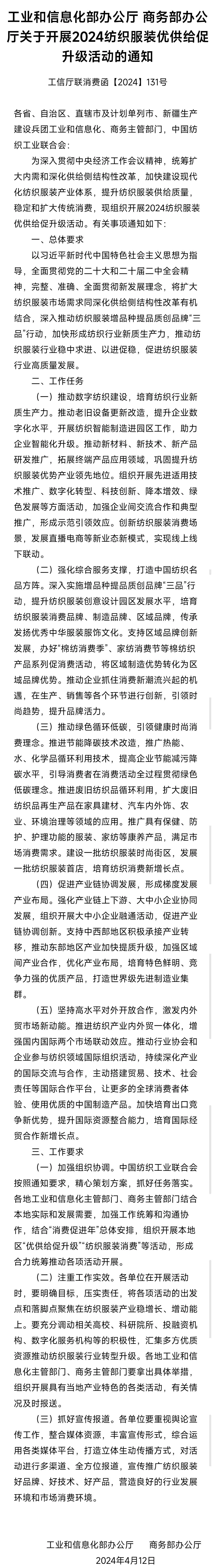 为深入贯彻中央经济工作会议精神,统筹扩大内需和深化供给侧结构性改革,加快建设现代化纺织服装产业体系,提升纺织服装供给质量,稳定和扩大传统消费。近日,工业和信息化部办公厅、商务部办公厅联合发布通知,组织开展2024纺织服装优供给促升级活动。