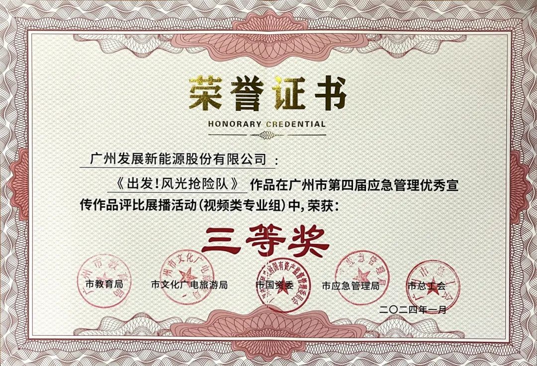 近期,市安委会、市减灾委、市教育局、市文化广电旅游局、市应急管理局、市国资委和市总工会联合举办的广州市第四届应急管理优秀宣传作品评比展播活动评比结果揭晓,广州发展新能源股份有限公司报送的原创视频《出发!风光抢险队》在全市1464个参赛作品中脱颖而出,荣获视频类专业组“三等奖”。