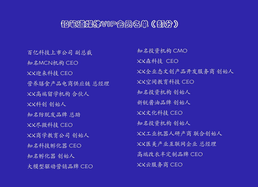 其中50%以上为企业创始人,另有40%为CXO、品牌市场公关负责人,其中不乏知名上市公司。