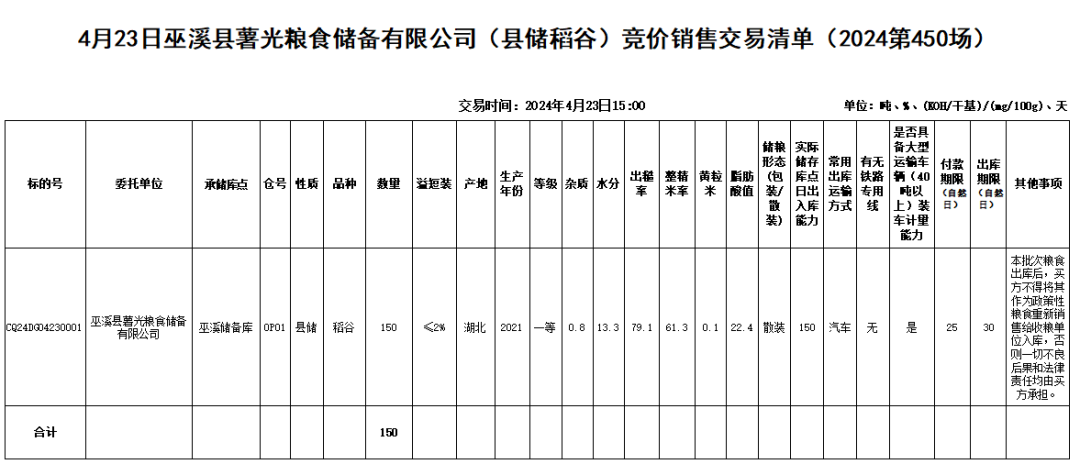 受巫溪县薯光粮食储备有限公司委托,重庆市粮油批发市场有限责任公司(即国家粮食重庆交易中心,以下简称“批发市场公司”)定于2024年4月23日15:00举办巫溪县薯光粮食储备有限公司(县储稻谷)竞价销售交易会,现将有关事项公告如下: