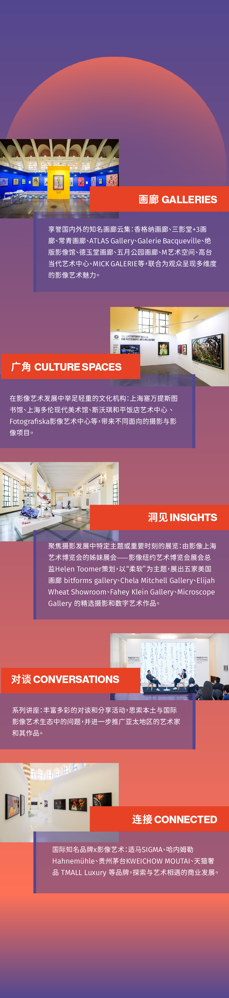 影像上海艺术博览会创立于2014年,旨在回应亚太地区对影像艺术收藏日益增长的兴趣与需求。作为专注于影像艺术媒介的国际平台,影像上海艺术博览会已在过去几年中,对亚洲艺术影像市场起到了至关重要的推动作用,亦建立起了关于影像艺术媒介最为权威和活跃的交流。博览会始终保持开拓精神,聚焦国际前沿,以博物馆品质呈现版块与内容,为亚太藏家、观众和专业人士提供欣赏和发现影像艺术的上佳体验。影像上海艺术博览会由Creo主办,是安格斯·蒙哥马利艺术(Angus Montgomery Arts)的重要组成部分。