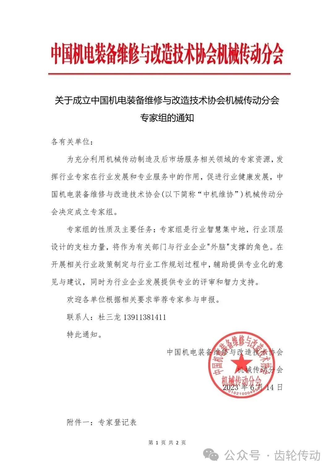 关于成立中国机电装备维修与改造技术协会机械传动分会专家组的通知