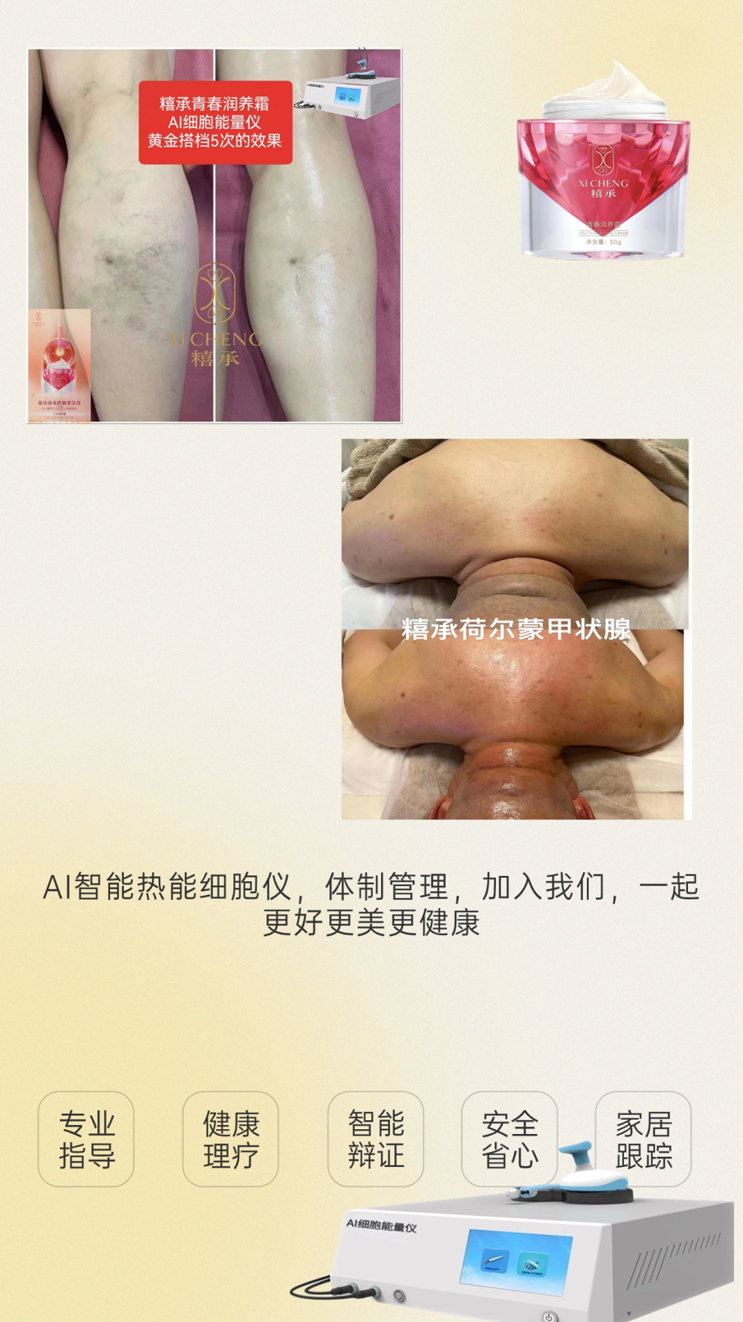 亿慧康科技健康养生凭借AI智能热能细胞能量仪和禧承青春润养霜王牌产品,赢得大众青睐,其产品经过严格科研和测试,品质有保障,我们有专业智能化技术交付和专业团队提升质量,让顾客极大程度解决问题诉求和变现能量。