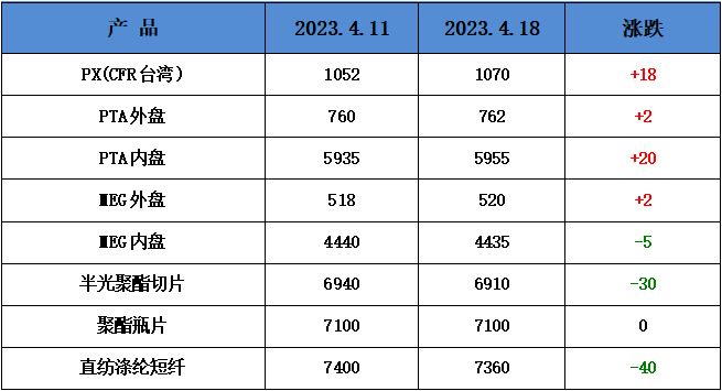 聚酯方面:本周国际先跌后涨。周初,因为地缘冲突有所缓和,国际油价冲高回落,至4月19日,受以色列导弹袭击了伊朗目标的影响,国际油价短线飙升超3%站上90美元/桶大关。截至4月18日收盘,纽约商品交易所5月交货的轻质原油期货价格上涨4美分,收于每桶82.73美元,涨幅为0.05%;6月交货的伦敦布伦特原油期货价格下跌18美分,收于每桶87.11美元,跌幅为0.21%。