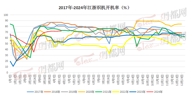 织造方面,从商务部盛泽指数可以看出,夏季服装、工装及户外用品等相关面料需求整体尚可,本周工厂开工相对坚挺,织造工厂的负荷稳定在80.4%。坯布库存方面,厂商谨慎情绪延续,周内工厂内坯布库存量窄幅增加,坯布库存上升至32.9天。