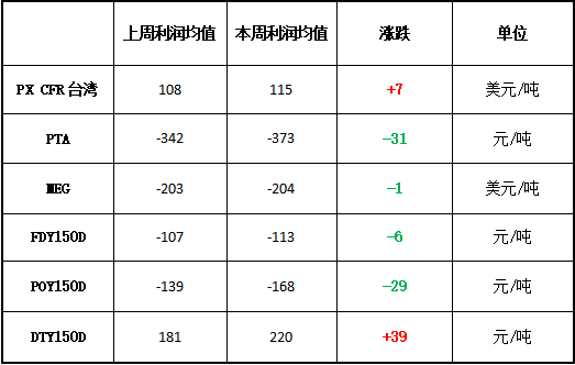 本周PX盈利较上周小幅增加,目前其盈利至115美元/吨。PTA方面,本周亏损有所增加,目前其亏损至373元/吨附近。乙二醇方面,本周亏损略有增加,目前亏损204美元/吨。涤纶长丝方面,本周上游原料价格回落,FDY150D亏损增加,亏损113元/吨;POY 150D同样亏损增加,目前亏损168元/吨;DTY 150D盈利增加,目前盈利220元/吨。