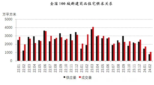 从总体的数据来看,2月份,全国百城新建商品住宅供应面积为793万平方米,而成交面积却达到1059万平方米,呈现出供小于求的态势。