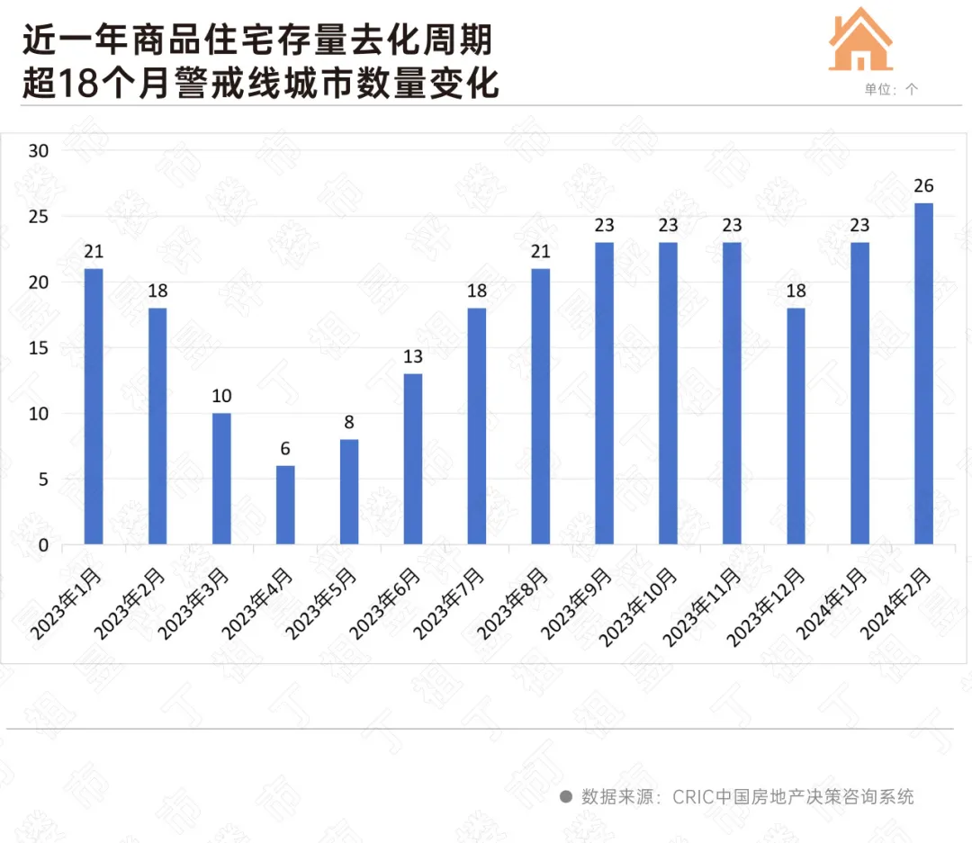 2024年2月,重点30城中,有26城去化周期超过18个月警戒线,占比超八成。