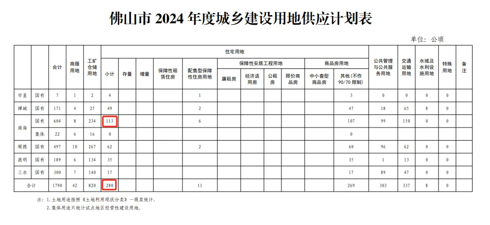 佛山2024年计划供应总量将控制在1790公顷,其中住宅用地280公顷,较去年相比大幅下调了14.4%,为近4年最低。