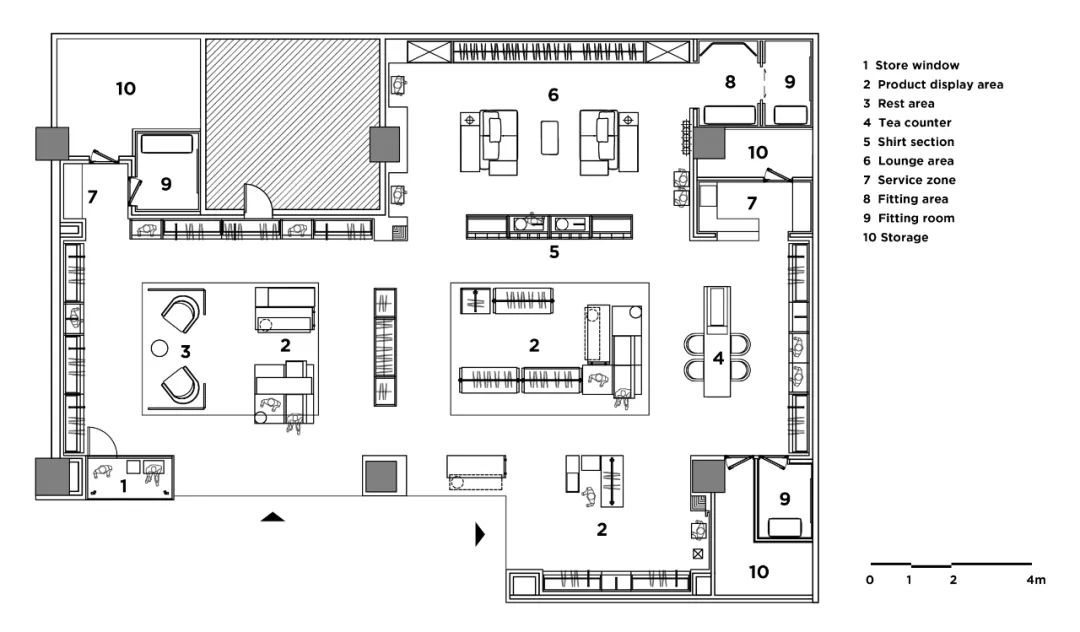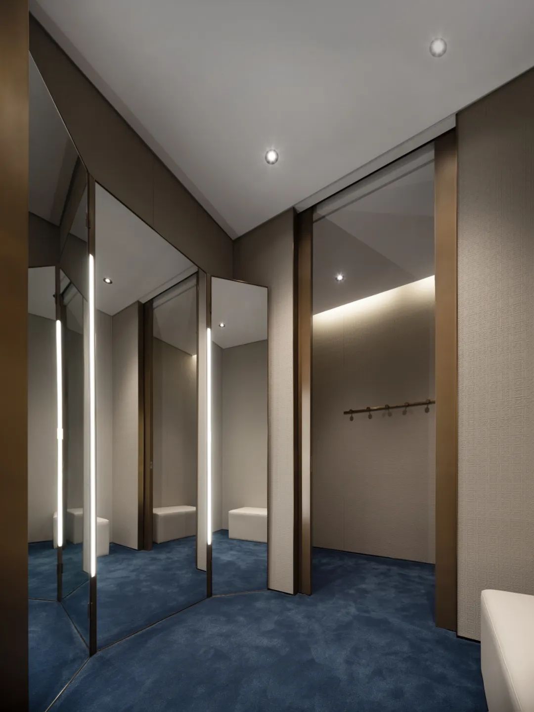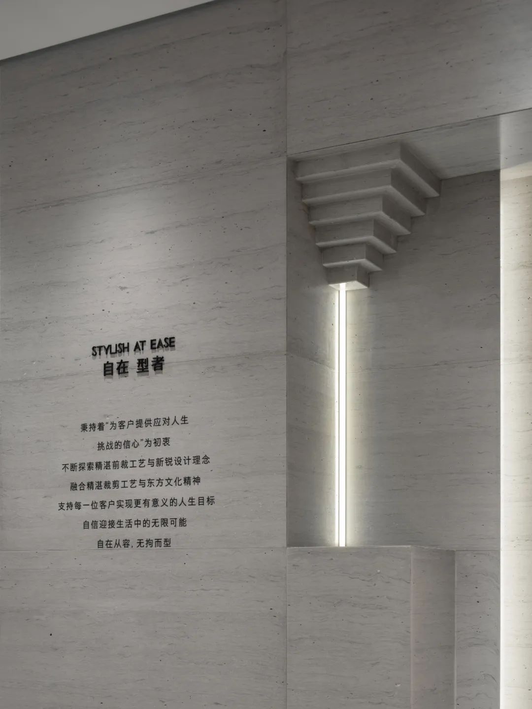 这个区域内,设计师追溯定制的概念,以皮尺的刻度为元素打造精品定制墙,呈现精致严谨的精英气质。